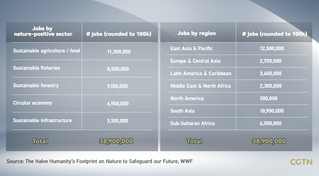 Prediction of sectoral and regional breakdown of job availability if subsidies are provided to nature-friendly sectors, according to WWF. /CGTN