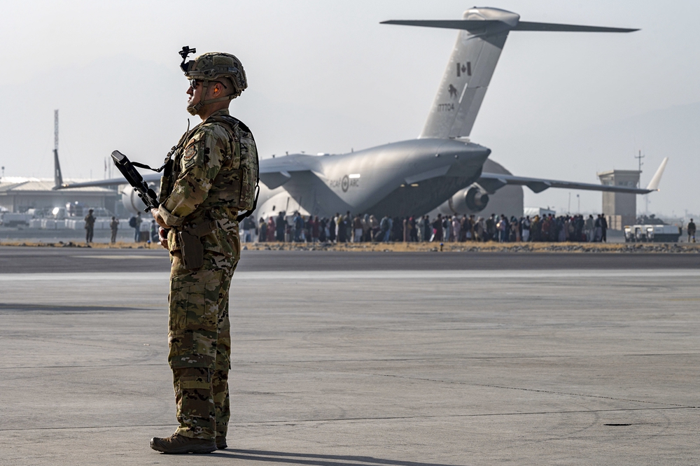 In this image provided by the U.S. Air Force, a U.S. Air Force security forces raven, assigned to the 816th Expeditionary Airlift Squadron, maintains a security cordon around a U.S. Air Force C-17 Globemaster III aircraft in support of Operation Allies Refuge at Hamid Karzai International Airport in Kabul, Afghanistan, August 20, 2021. /CFP