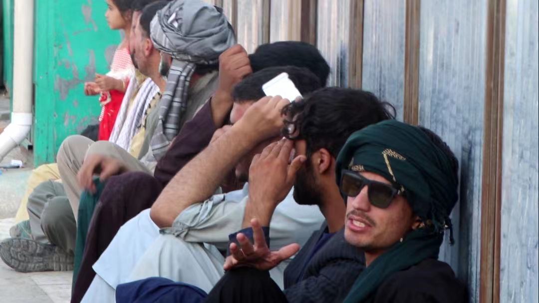 Afghan civilians are seen near the Hamid Karzai International Airport in Kabul, Afghanistan, August 22, 2021, a week after the Taliban's takeover. The city's airport is in limbo as Afghans' attempts to leave the country are being thwarted by the chaos caused by the withdrawal of U.S. troops and their allies' forces. /CGTN