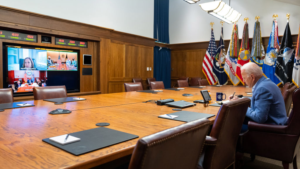 U.S. President Joe Biden at a video conference with the national security team to discuss the ongoing efforts to draw down the civilian footprint in Afghanistan at Camp David in Frederick County, Maryland, August 16, 2021. /Getty