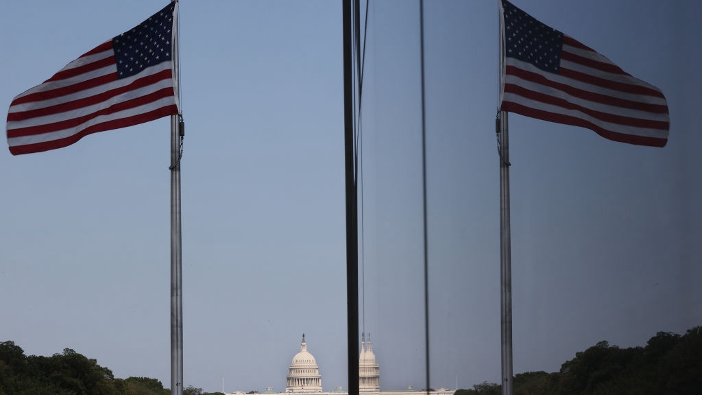 The U.S. Capitol is reflected in the glass of the Washington Monument visitors center entrance on the National Mall in Washington, DC, August 12, 2021. /Getty