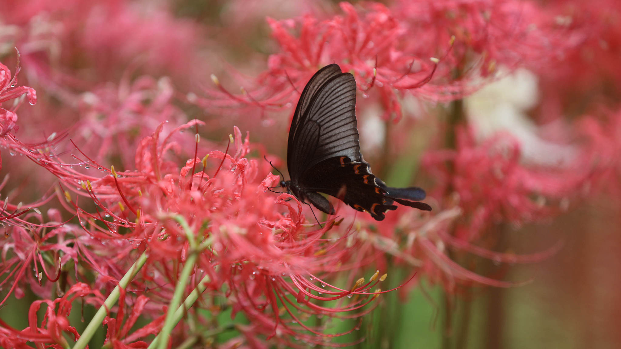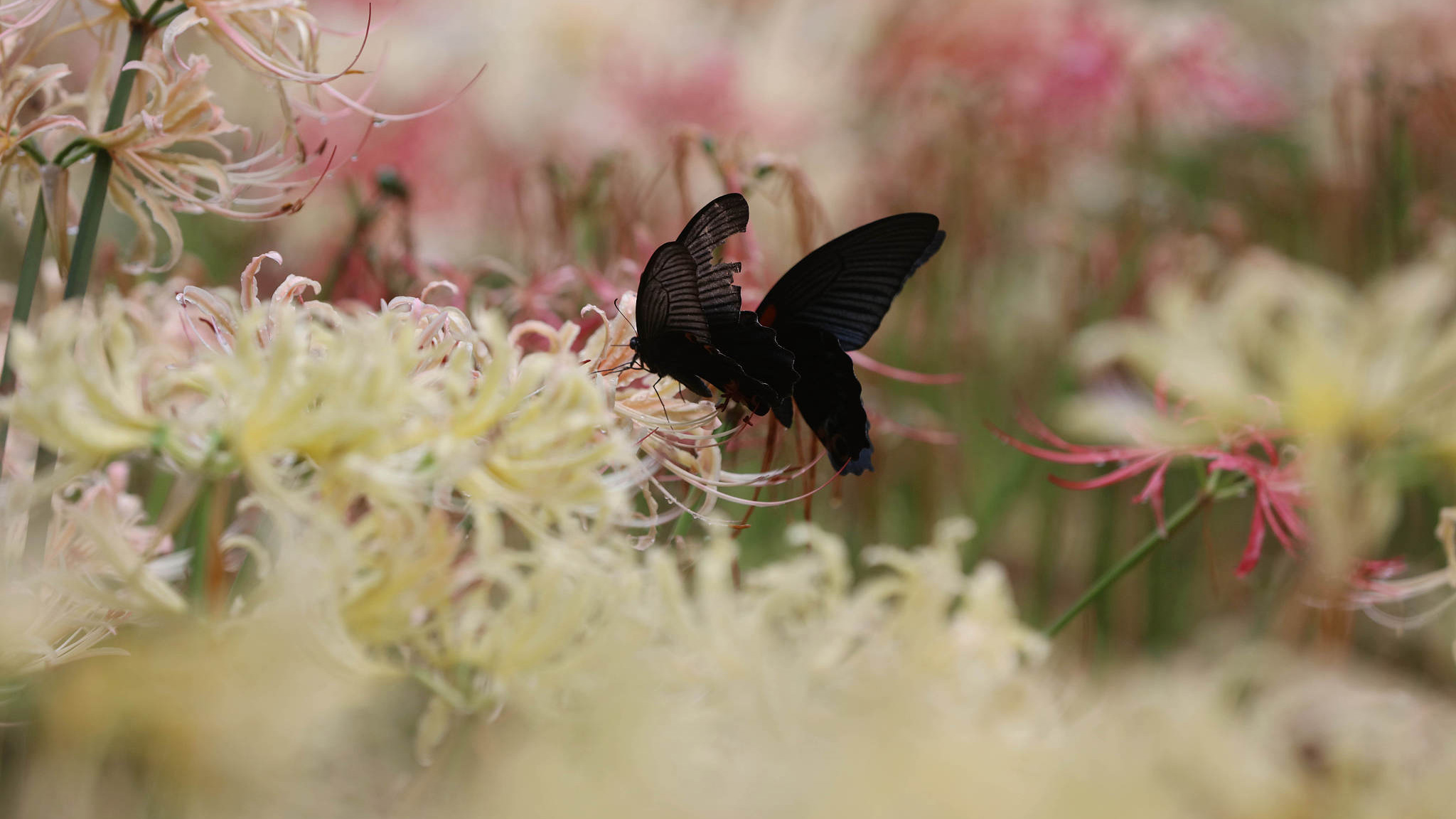 On August 27, 2021, in the Zhangjiajie Wulingyuan Scenic Area in central China's Hunan Province, the spider lilies were seen blossoming vividly, attracting butterflies including common Mormons.