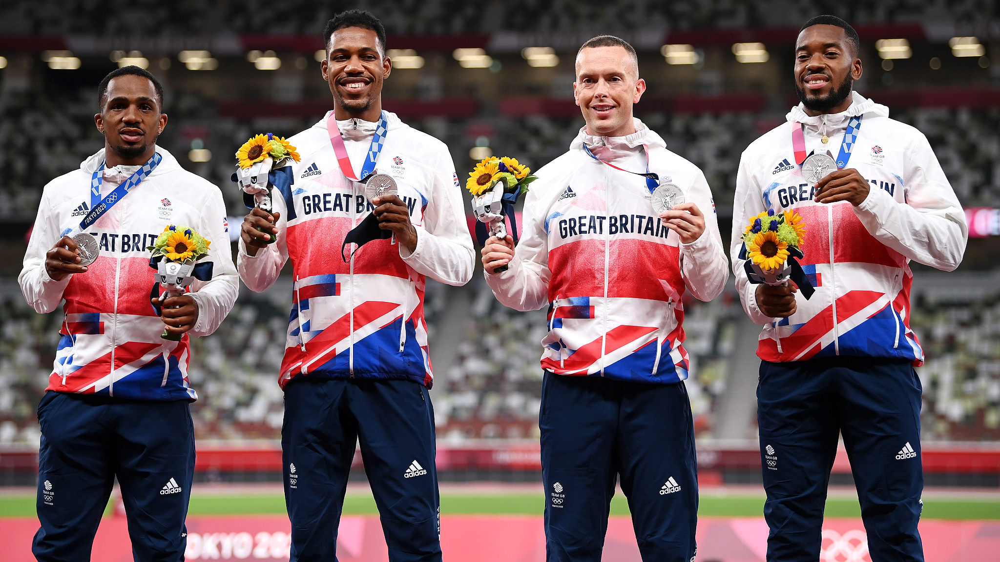 (L-R) Chijindu Ujah, Zharnel Hughes, Richard Kilty and Nethaneel Mitchell-Blake of Team Great Britain celebrate during the medal ceremony for the men's 4x100m relay event at the Tokyo Olympics in Tokyo, Japan, August 7, 2021. /CFP