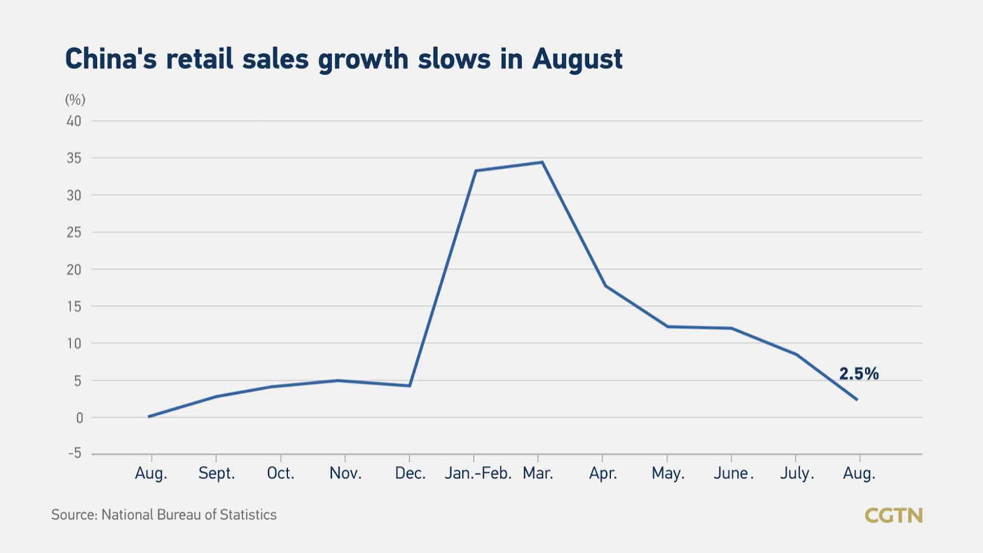 China's retail sales of consumer goods rose 2.5 percent in August from a year earlier, far below market expectations, while value-added industrial output went up 5.3 percent year on year, both slowing from July due to new COVID-19 outbreaks, official data (link in Chinese) showed Wednesday.