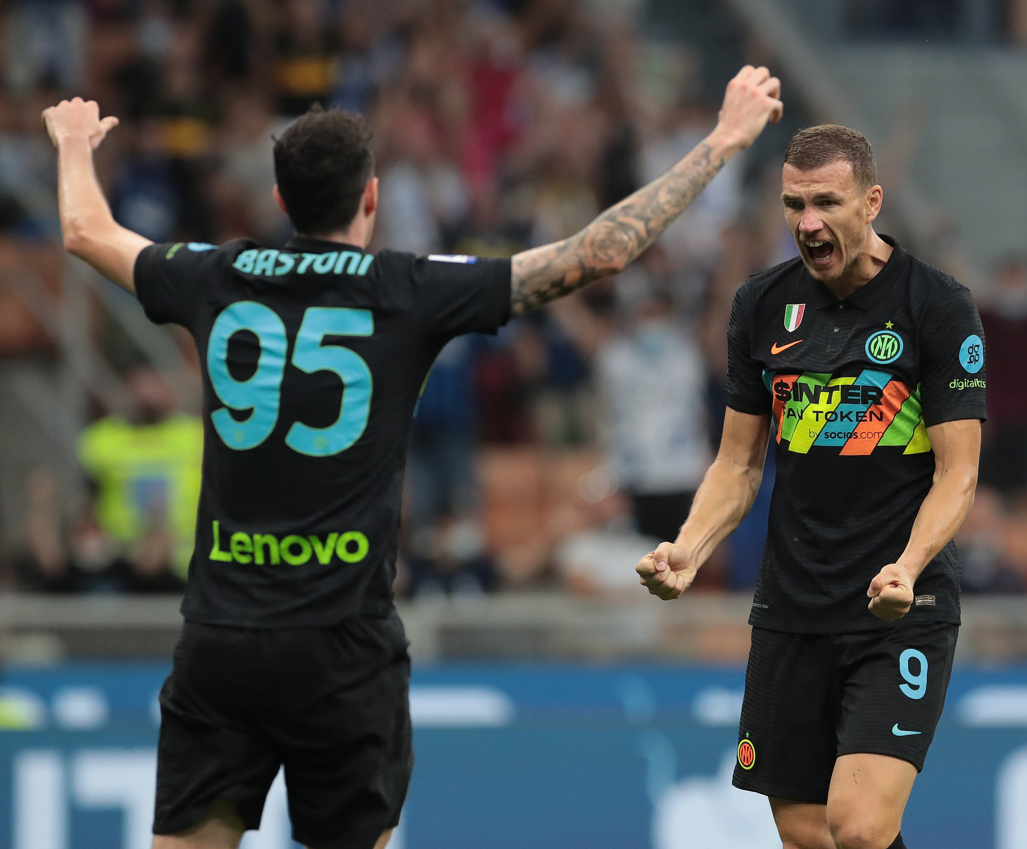 Edin Dzeko (R) of Inter Milan celebrates with teammate Alessandro Bastoni after scoring a goal against Bologna during their Serie A match at Stadio Giuseppe Meazza in Milan, Italy, September 18, 2021. /CFP