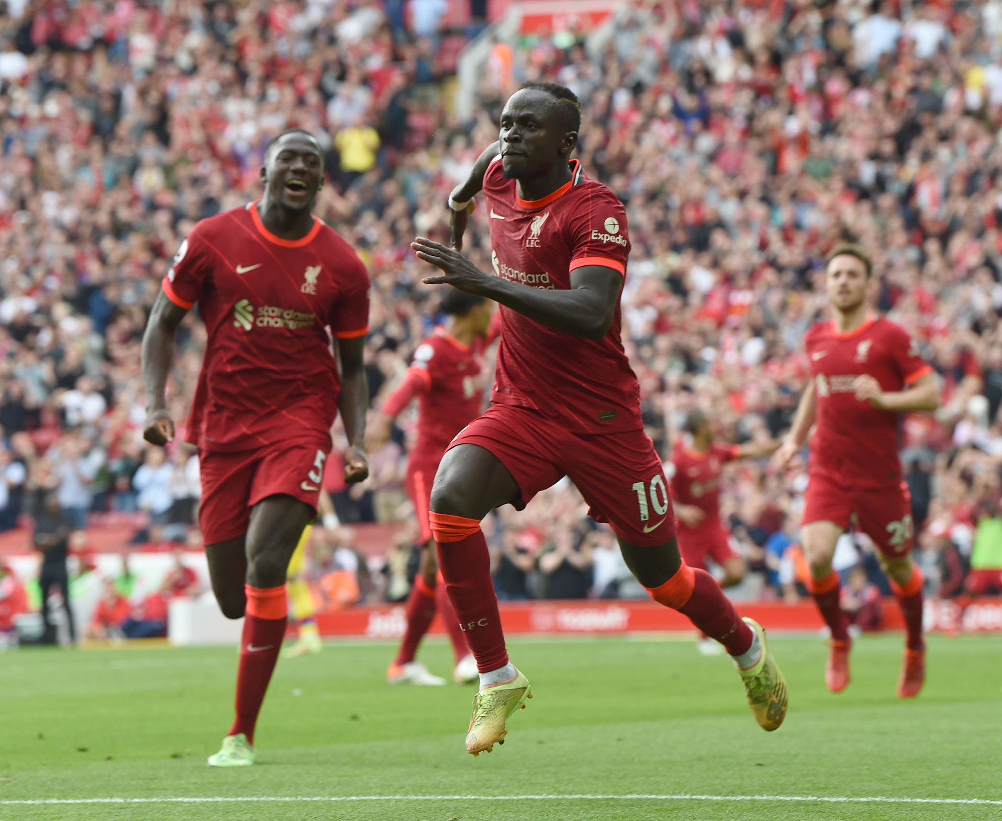 Sadio Mane (C) of Liverpool celebrates after scoring the first goal against Crystal Palace during their Premier League match at Anfield in Liverpool, England, September 18, 2021. /CFP