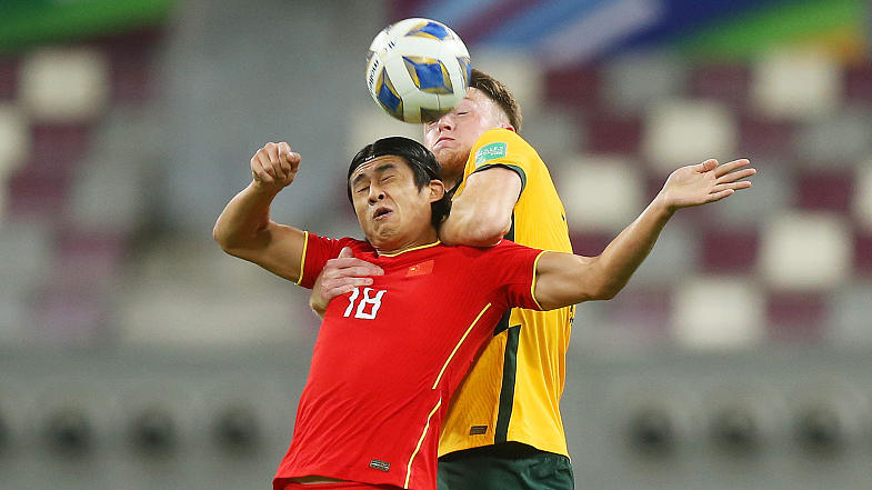 Zhang Yuning (#18) of China competes in the 2022 FIFA World Cup qualifier game against Australia at Khalifa International Stadium, September 2, 2021. /CFP