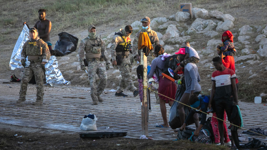 U.S. Border Patrol agents look on after Haitian immigrant families crossed the Rio Grande to Del Rio, Texas, from Ciudad Acuna, Mexico, September 23, 2021. /Getty