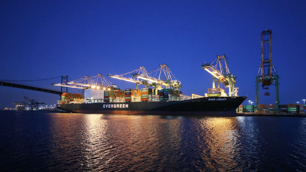 The container ship Ever Legacy is offloaded with cranes after arriving from China's Taiwan to the Port of Los Angeles, March 6, 2020. /Getty