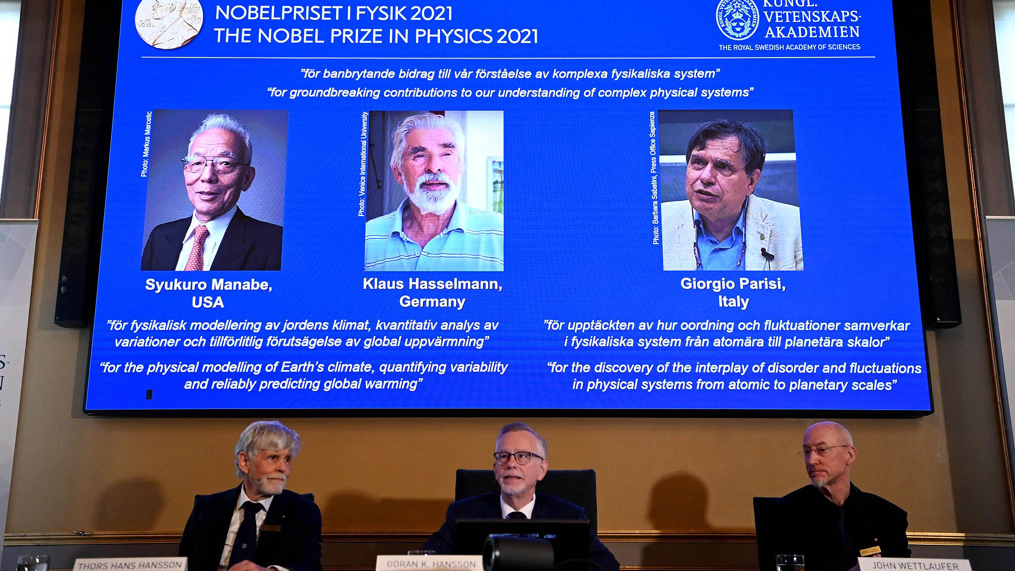 The Nobel Prize for Physics was awarded to three scientists on Tuesday for their breakthrough work on climate change. Syukuro Manabe of Japan and Klaus Hasselmann of Germany worked on models that help predict global warming. The Nobel prize committee said the two scientists laid the foundation of our knowledge of the Earth's climate and how humans influence it.