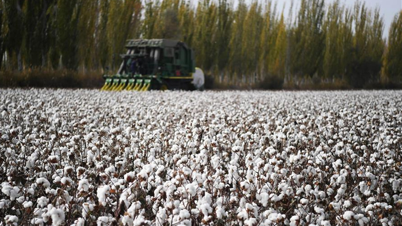 A cotton harvesting machine works in a field in Awat County, northwest China's Xinjiang Uygur Autonomous Region, October 25, 2019. /Xinhua