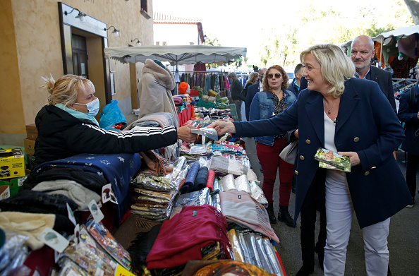 Leader of French far-right party Rassemblement National and candidate for the 2022 presidential elections Marine Le Pen visits a traditional provencal market during the election campaign in Pernes-les-Fontaines near Avignon, France, October 16, 2021. /Getty