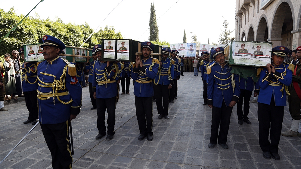 Honor guards carry coffins of Houthi fighters who were killed in the ongoing fighting over the control of Marib city during a funeral procession in Sanaa, Yemen, October 20, 2021. /CFP