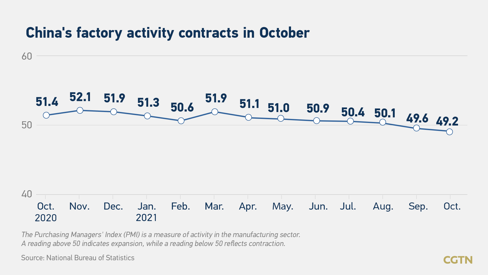 The official manufacturing Purchasing Managers' Index (PMI) slipped to 49.2 in October, the second contraction since February 2020 after 49.6 in September, data from the National Bureau of Statistics (NBS) showed on Saturday.