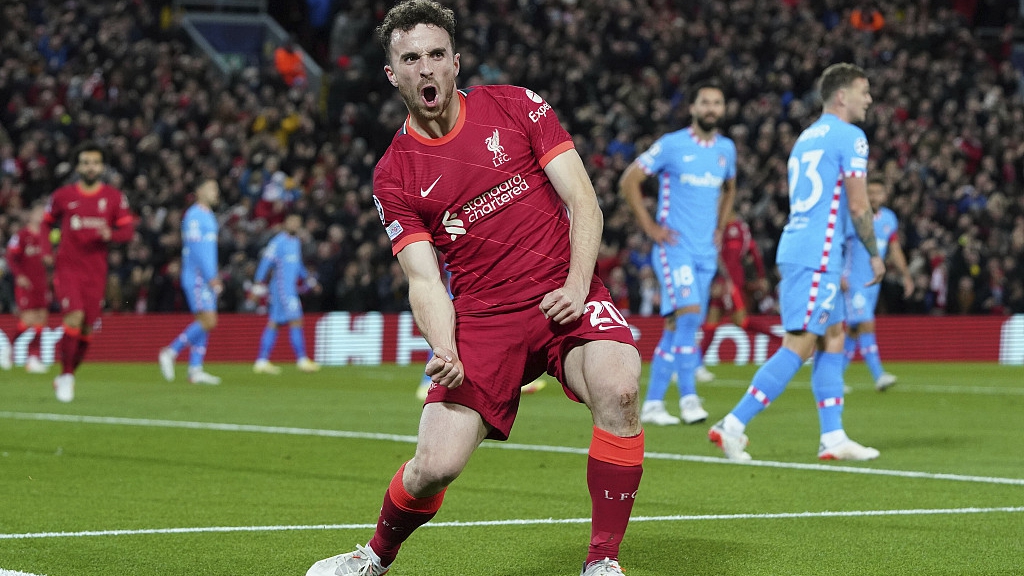 Liverpool's Diogo Jota celebrates after scoring his side's first goal during their Champions League clash with Atletico Madrid in Liverpool, England, November 3, 2021. /CFP