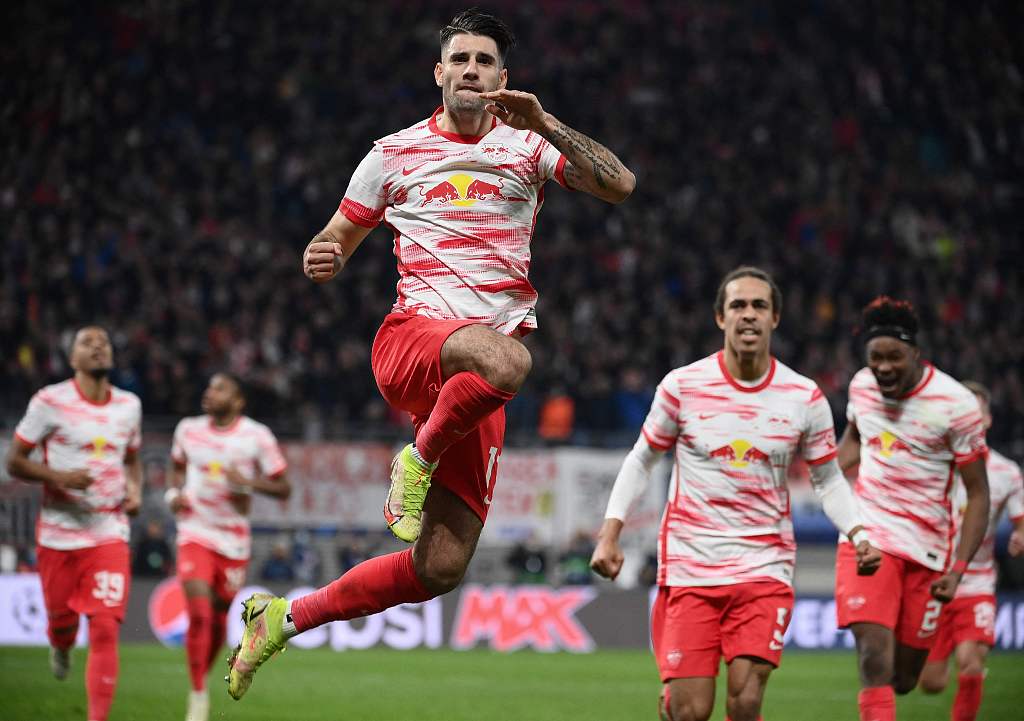 Leipzig's Dominik Szoboszlai (C) celebrates scoring a last-gasp penalty during their Champions League clash with Paris Saint-Germain in Leipzig, Germany, November 3, 2021. /CFP