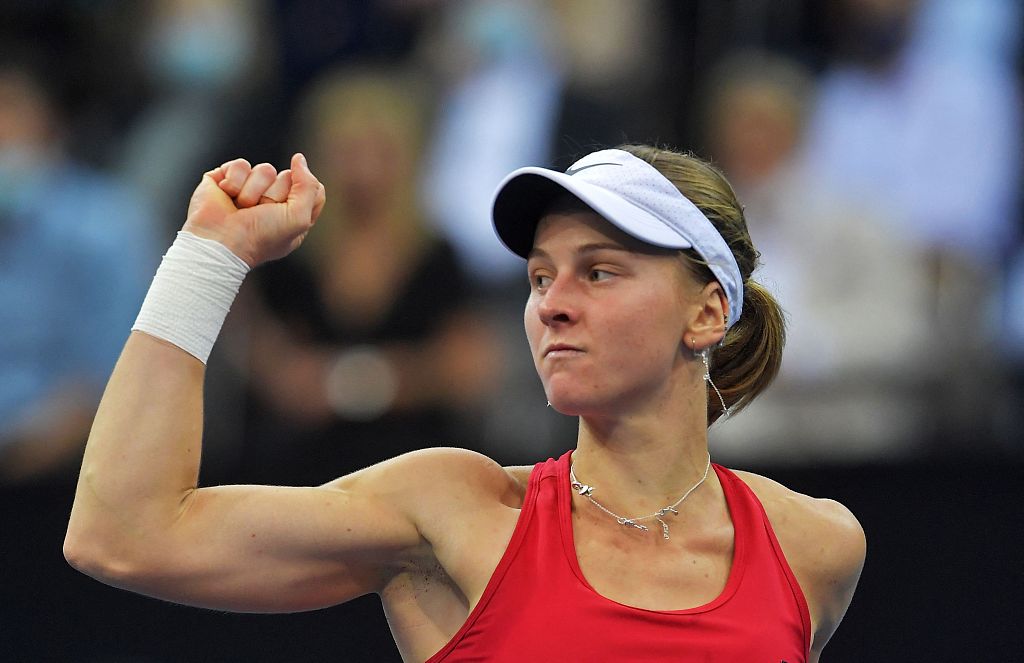 Liudmila Samsonova of Russia reacts to a game win during the Billie Jean King Cup title in Prague, Czech Republic, November 6, 2021. /CFP
