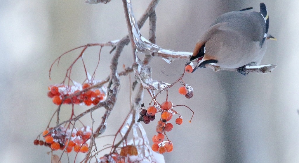 After the freezing rain, the temperature has dropped drastically in Harbin, northeast China's Heilongjiang Province. The cold weather has wrapped the red fruits of the rowan trees in crystal ice, transforming them into nature's version of the tempting sugar frosting on traditional Chinese winter snack, bingtanghulu. Although humans delight in the crispy sugar-coated hawthorn on a stick every winter, one can only guess whether the Bohemian waxwings, Naumann's thrushes and other migratory songbirds in the area for the winter are happy about the extra work it might take to get to the rowan fruits that comprise their usual seasonal feast.
