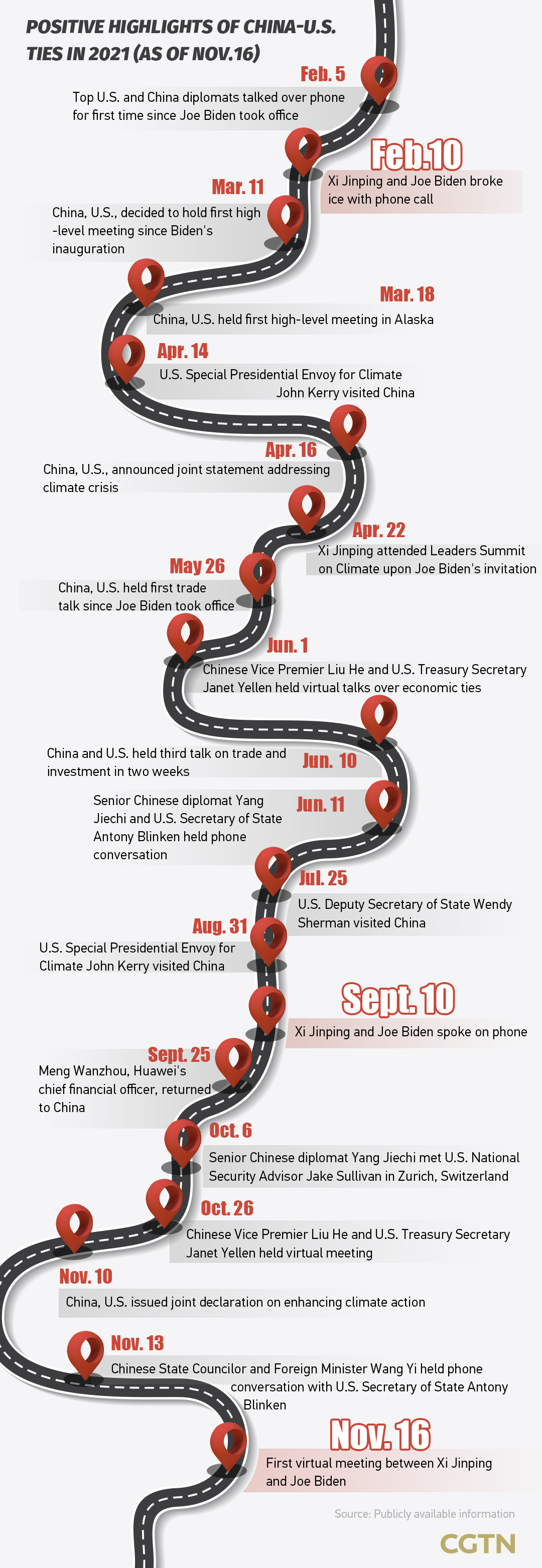 This year, in addition to the two direct interactions between the two leaders, China and the United States also conducted several high-level exchanges with focus on climate change, trade and some important and sensitive issues involving Taiwan, Hong Kong and the South China Sea.