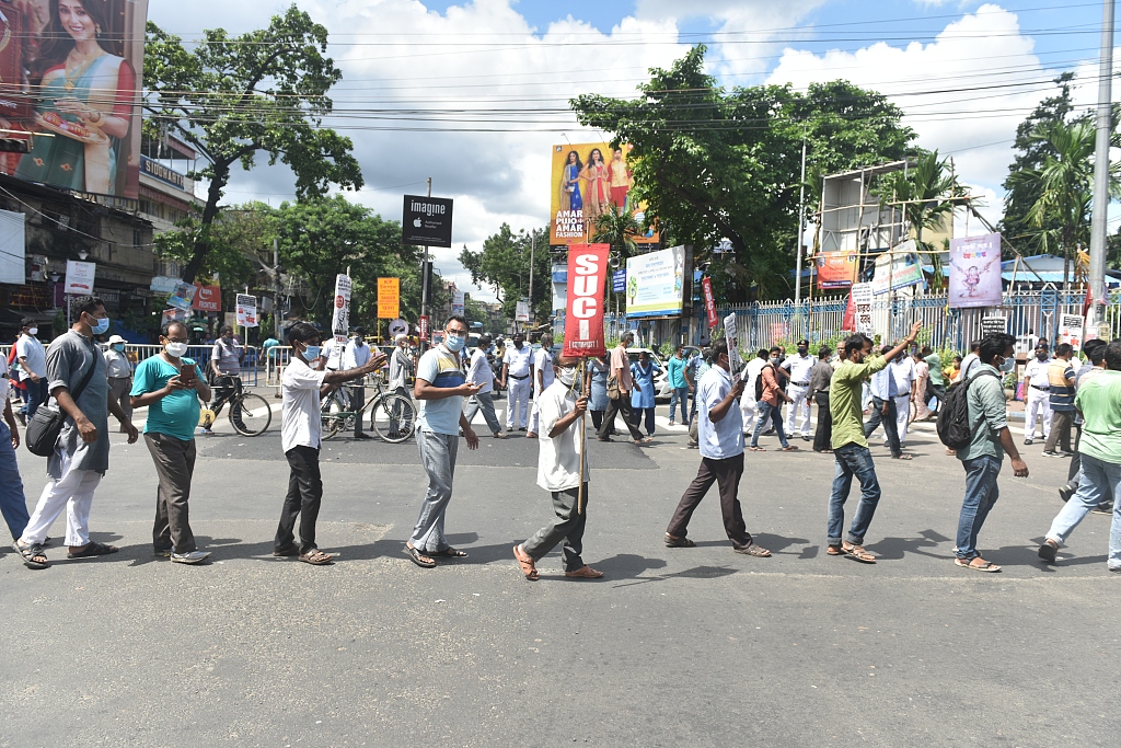 People protest on a street to mark a year of the three controversial farm laws passed last September by Parliament, in Kolkata, India, September 27, 2021. /CFP