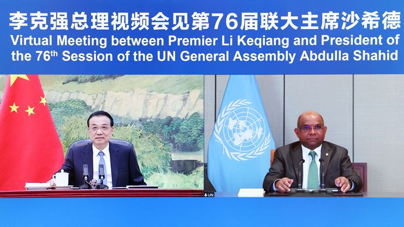 Li made his remarks during a virtual meeting with Abdulla Shahid, president of the 76th session of the United Nations General Assembly (UNGA) and foreign minister of the Maldives.
