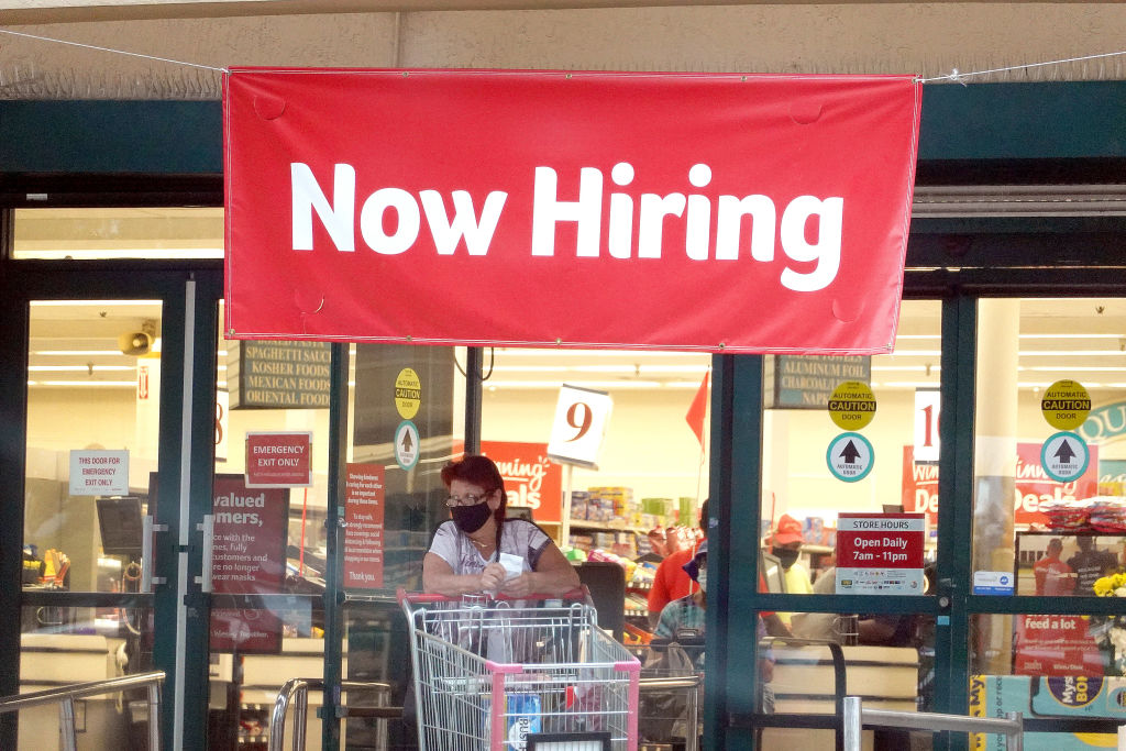 A Now Hiring sign hangs near the entrance to a Winn-Dixie supermarket in Hallandale, Florida, U.S., September 21, 2021. /Getty