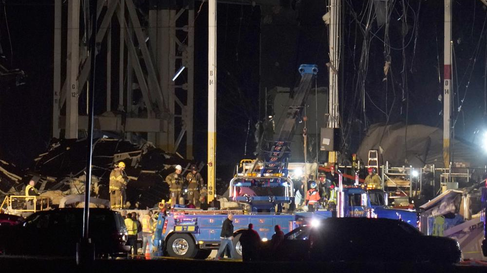 First responders work outside an Amazon fulfillment center after it was heavily damaged when a strong thunderstorm moved through the area in Edwardsville, Illinois, U.S., December 10, 2021. /AP