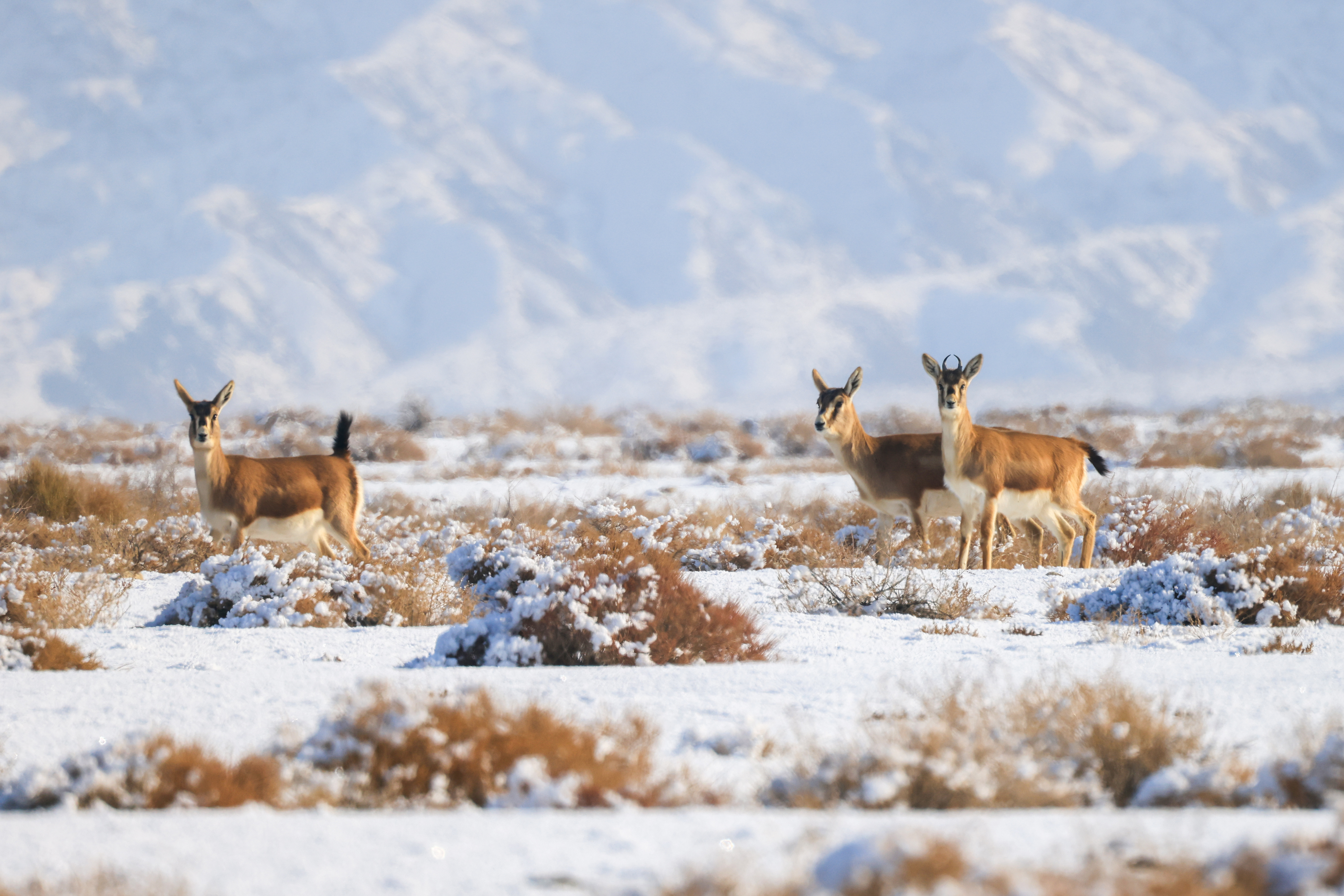 A group of giotered gazelles were captured on camera foraging in Bohu County of northwest China's Xinjiang Uygur Autonomous Region on Saturday.