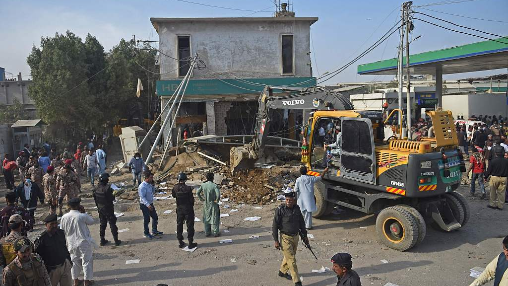 An excavator clears the debris of a bank building that collapsed after a gas blast in Karachi on December 18, 2021 /CFP