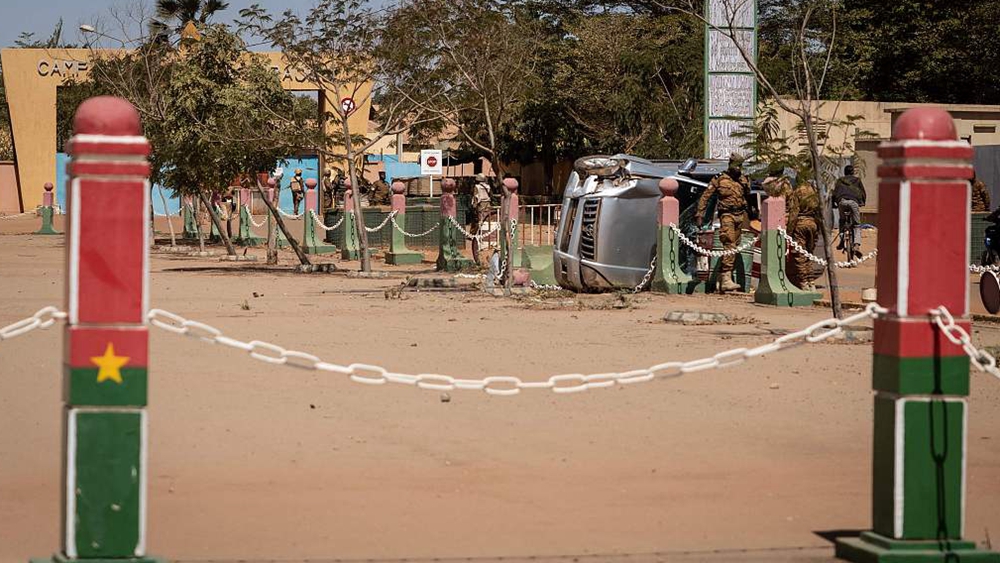 Burkina Faso soldiers stand by a damaged vehicle in front of the Guillaume Ouedraogo military camp in Ouagadougou, Burkina Faso, January 24, 2022. /CFP