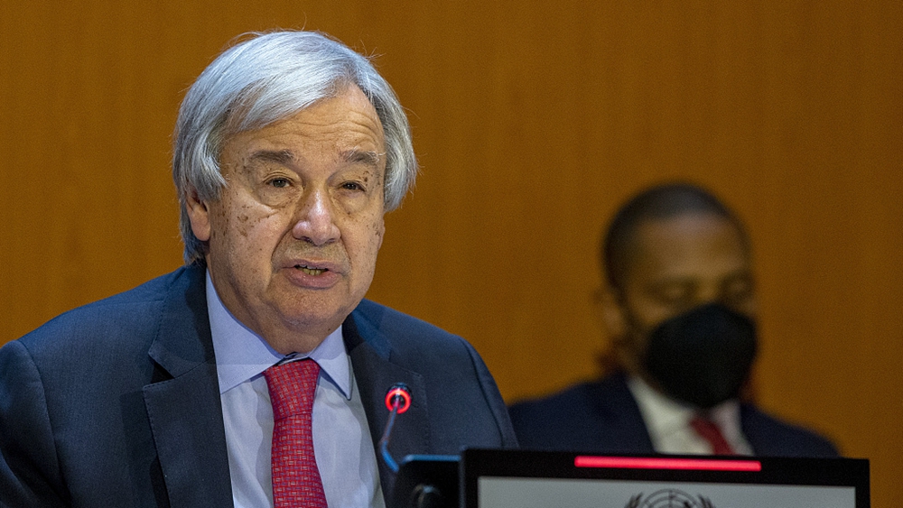 UN Secretary-General Antonio Guterres addresses his statement during the High-Level Ministerial Event on the Humanitarian Situation in Afghanistan at the European headquarters of the United Nation, in Geneva, Switzerland, September 13, 2021. /CFP