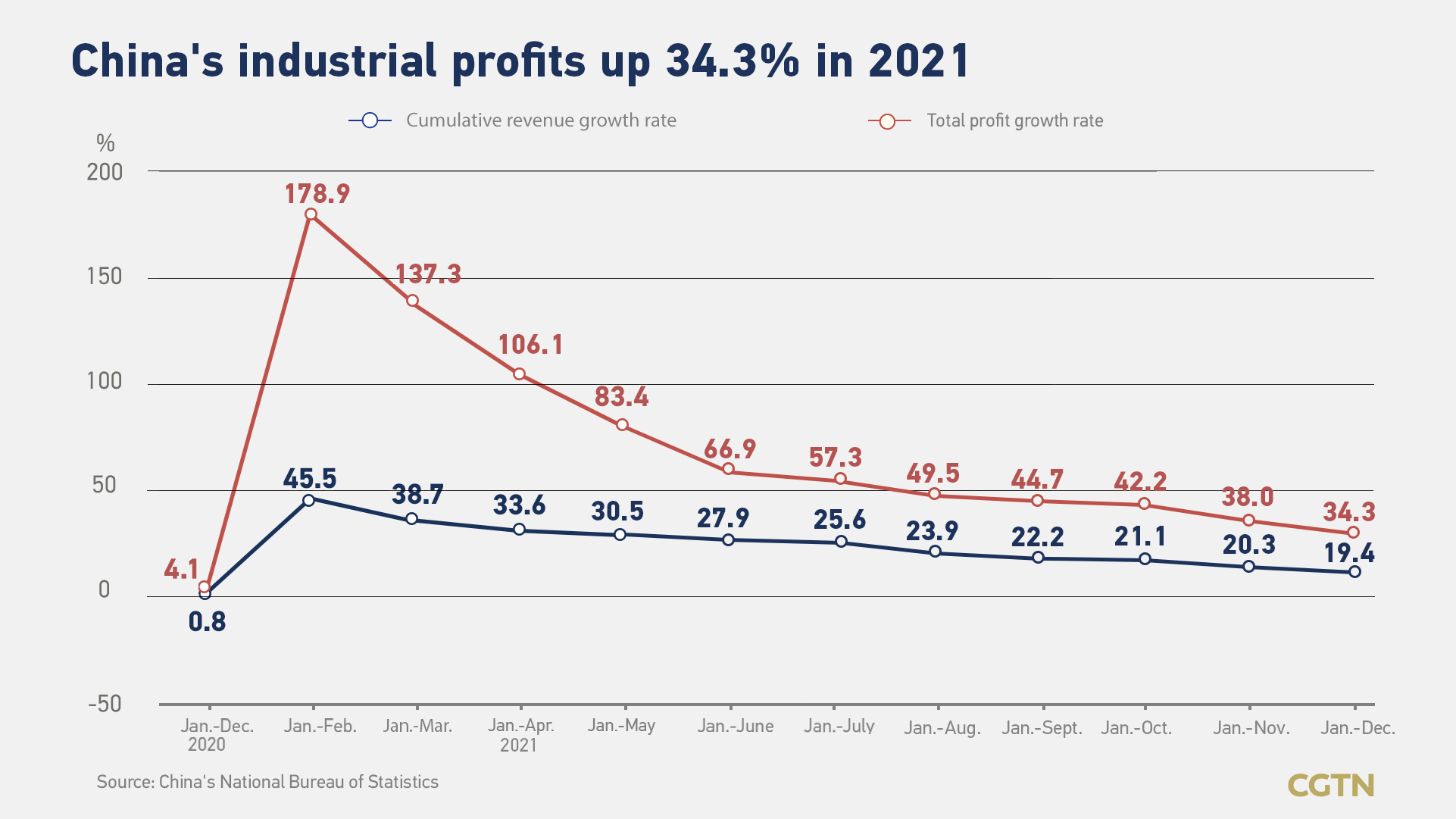 The annual profits of the country's major industrial firms totaled over 8.7 trillion yuan in 2021, increasing by 34.3 percent compared to the earlier year. In 2020, China's industrial firms grew 4.1 percent year on year to 6.45 trillion yuan.