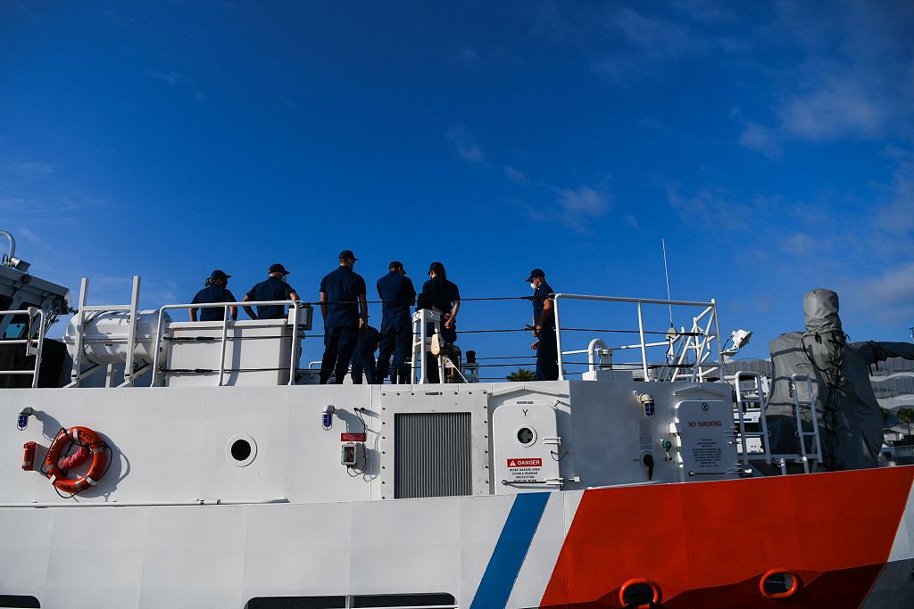U.S. Coast Guard personnel stand on the deck of a cutter at the U.S. Coast Guard Sector Miami in Miami, Florida, January 26, 2022. /CFP