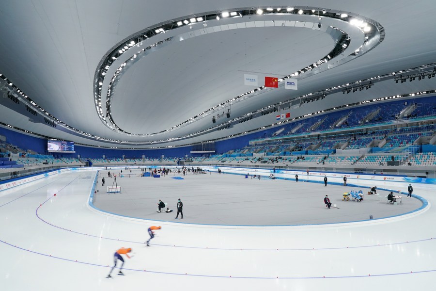 Athletes compete during the women's 1,500m final at the Experience Beijing Speed Skating China Open, October 10, 2021. /Xinhua