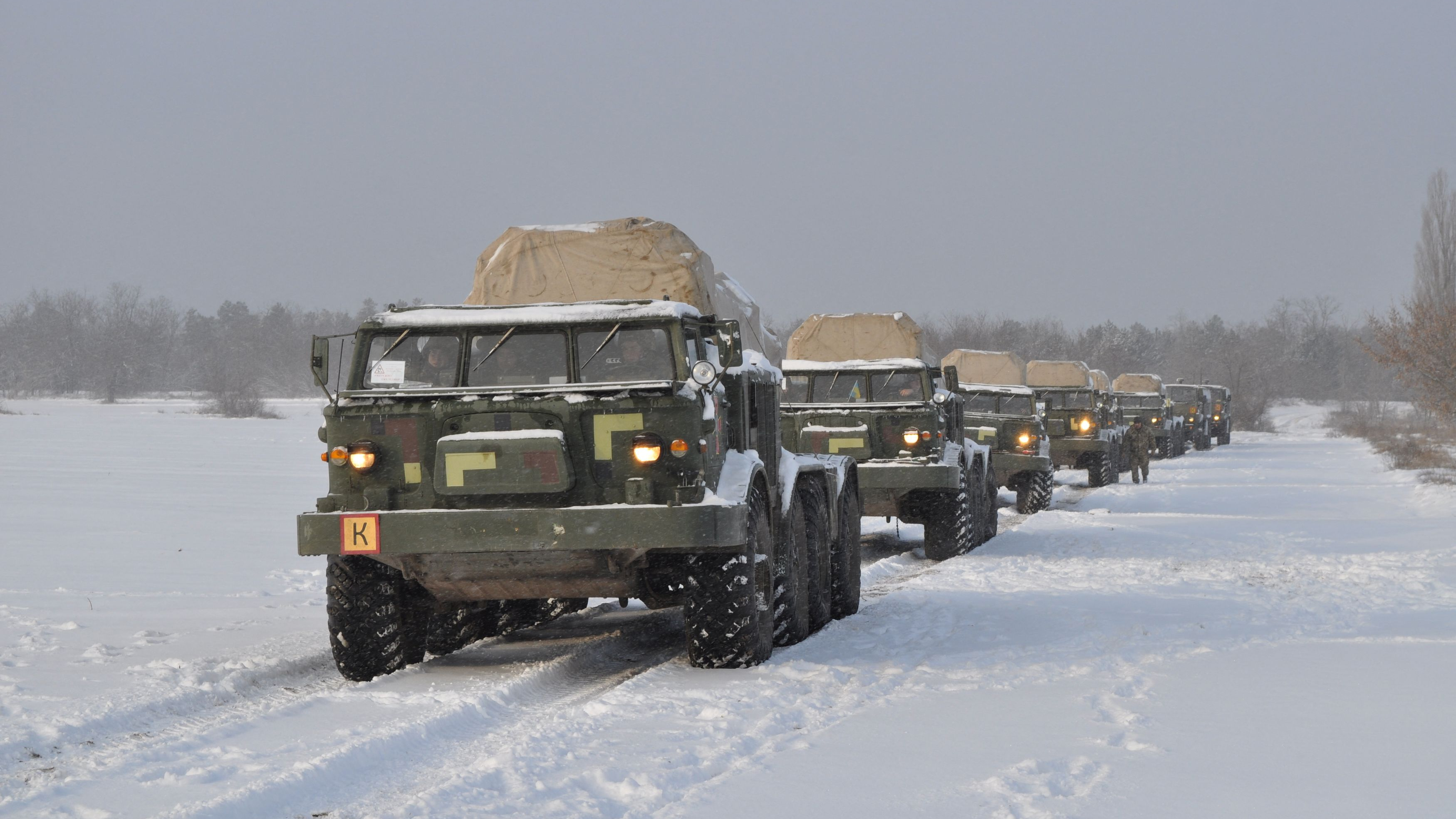 Service members of the Ukrainian Armed Forces drive self-propelled multiple rocket launcher systems during drills in the Kherson region, Ukraine, in this handout picture released February 1, 2022. /Reuters