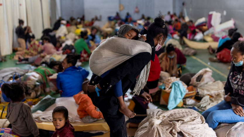 A woman carries a child as displaced locals find refuge in an evacuation center at the neighborhood of West Ankorondrano in Antananarivo, Madagascar, February 5, 2022. /Reuters