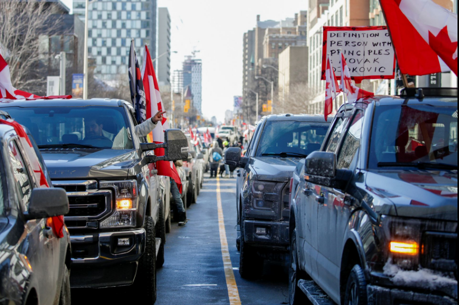 Protestors occupy Bloor Street West as truckers and supporters continue to protest coronavirus disease (COVID-19) vaccine mandates, in Toronto, Ontario, Canada, February 5, 2022. /Reuters