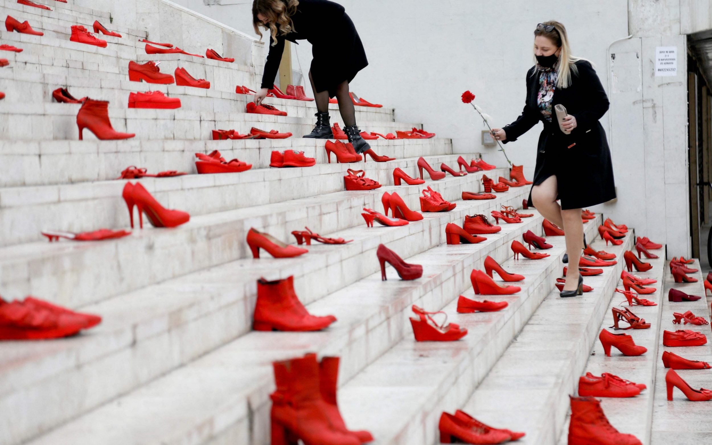 An installation of red women's shoes displayed as a symbol to denounce violence against women on International Women's Day at the main square of Durres in Tirana, Albania, March 8, 2021. /Getty
