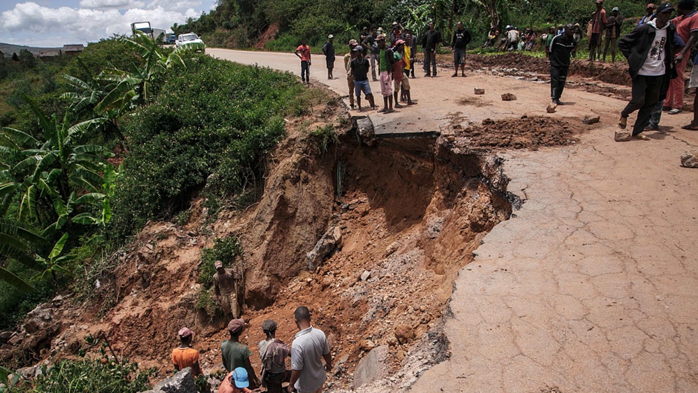 Residents look at a partially collapsed road following the passage of cyclone Batsirai in Ranomafana, Madagascar, February 7, 2022. /CFP