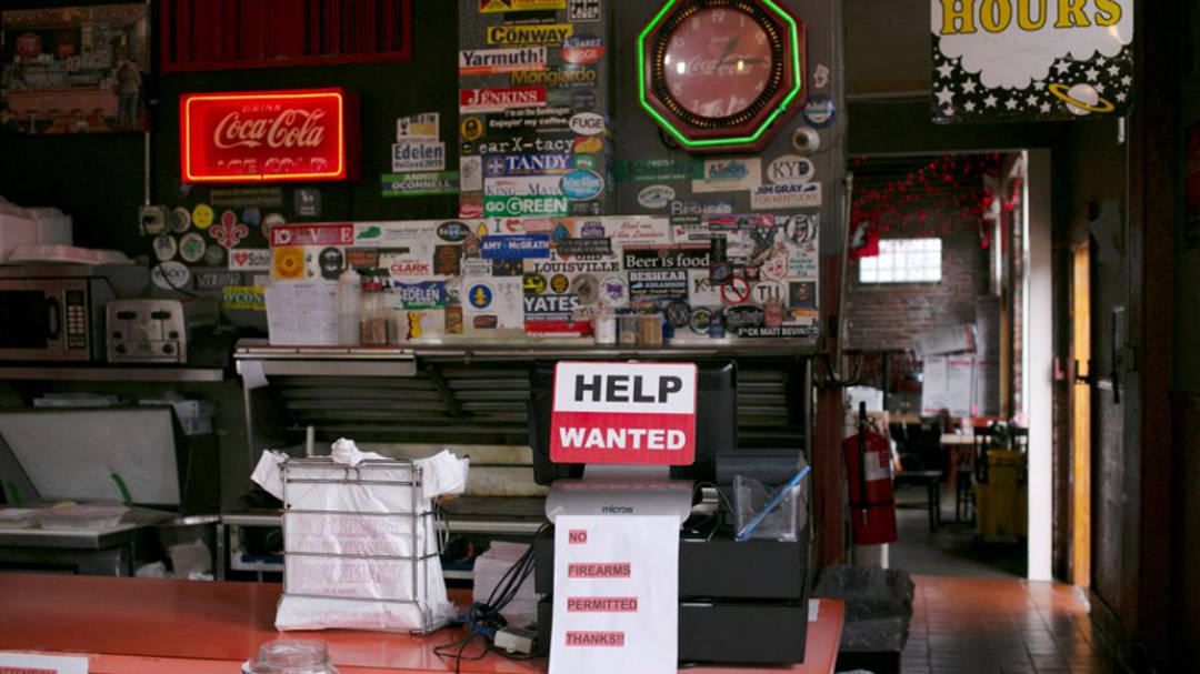 A hiring sign is seen at the register of Burger Boy restaurant, as many restaurant businesses face staffing shortages in Louisville, Kentucky, U.S., June 7, 2021. /Reuters