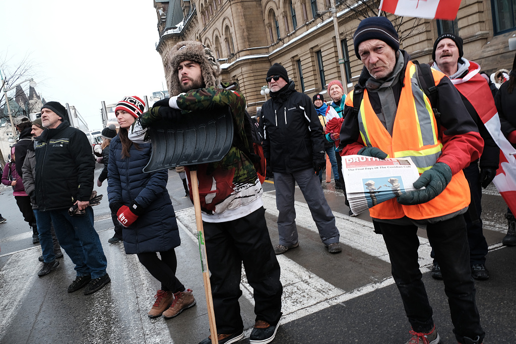 Truck drivers and their supporters gather to block the streets as part of a convoy of truck protesters against COVID-19 mandates on February 9, 2022 in Ottawa, Ontario, Canada. /CFP