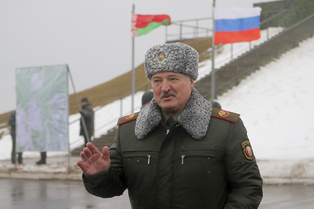 Belarusian President Alexander Lukashenko gestures while speaking to journalists at the Osipovichi training ground near Osipovichi, Belarus, February 17, 2022. /CFP