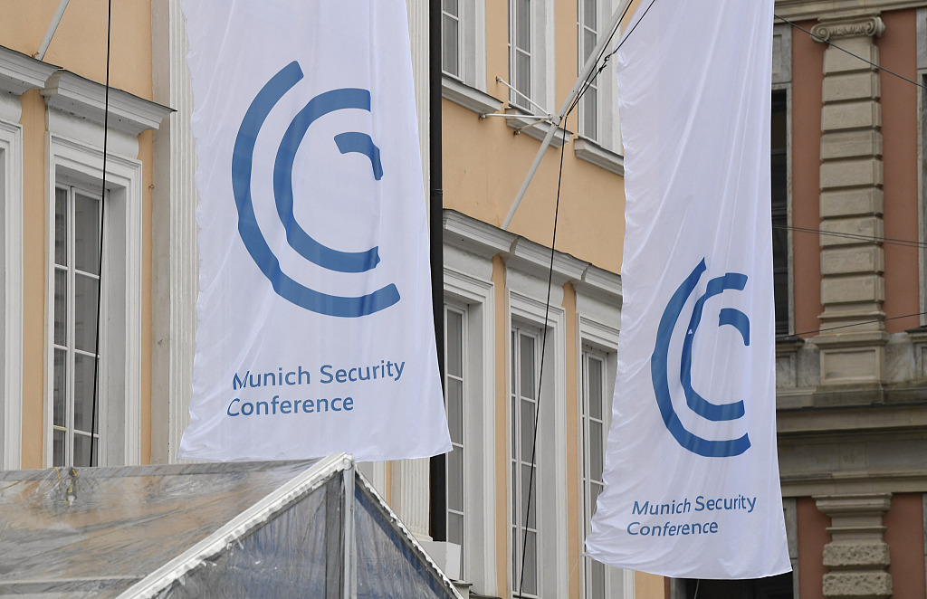 Flags with the logo of the Munich Security Conference hang at the Bayerischer Hof hotel, the venue for the Munich Security Conference (MSC) in Munich, southern Germany, February 18, 2022. /CFP