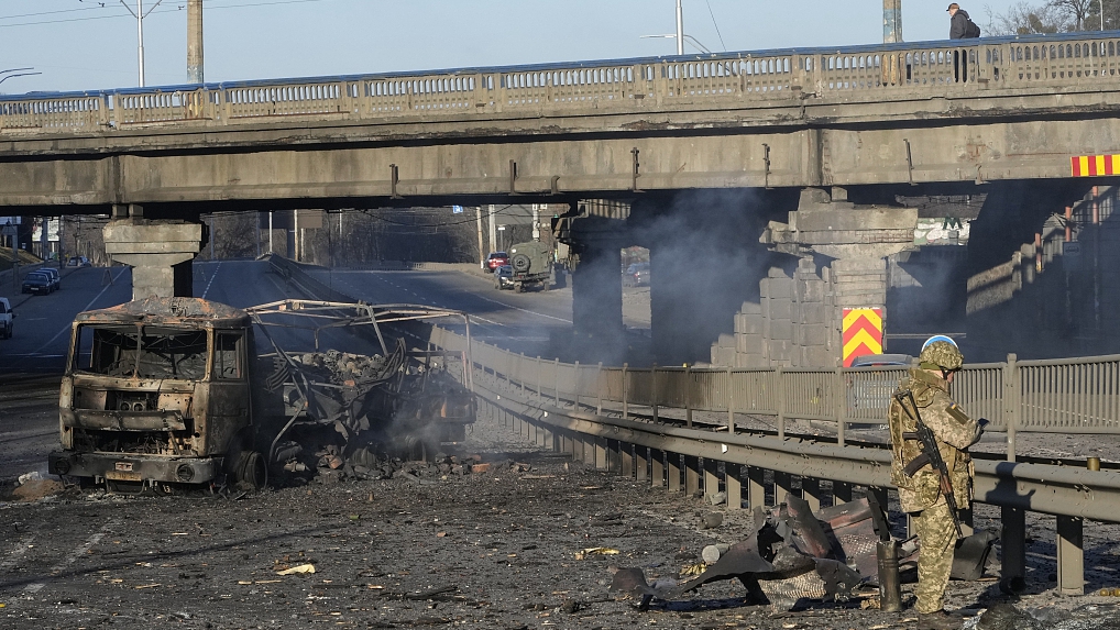 A Ukrainian soldier investigates debris of a burnt military truck in a street in Kyiv, Ukraine, February 26, 2022. /CFP