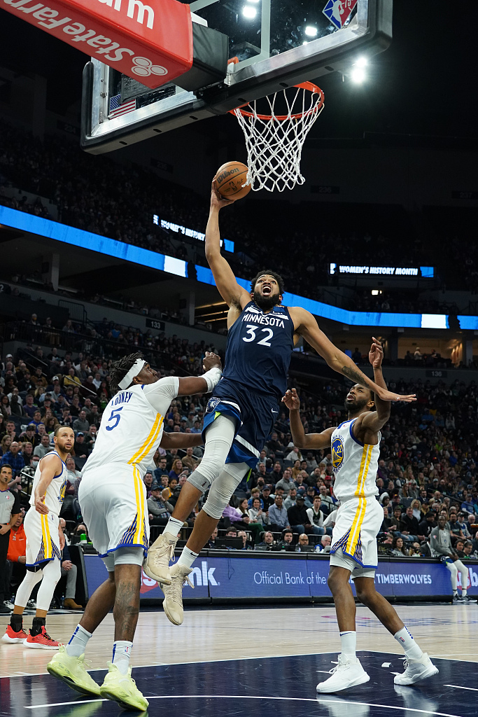 Karl-Anthony Towns (#32) of the Minnesota Timberwolves penetrates in the game against the Golden State Warriors at Target Center in Minneapolis, Minnesota, U.S., March 1, 2022. /CFP