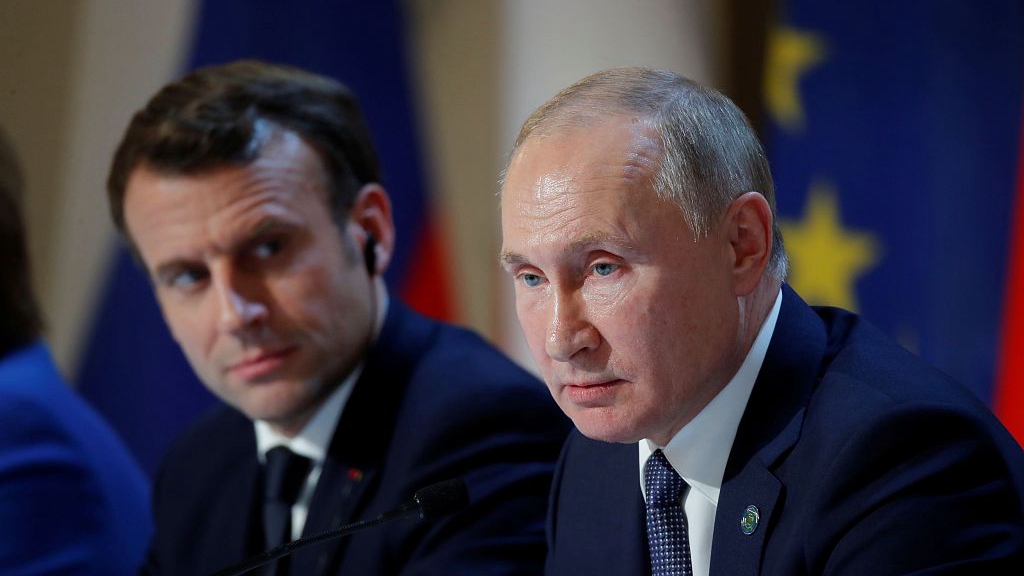 In this file photo taken on December 10, 2019, French President Emmanuel Macron (L) and Russian President Vladimir Putin (R) give a press conference after a summit on Ukraine at the Elysee Palace in Paris, France. /CFP