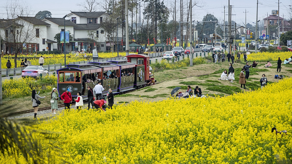 Tourists visit a field of rapeseed flowers at Wuxing Village, Chengdu City, the capital of southwest China's Sichuan Province, March 1, 2022. /CFP