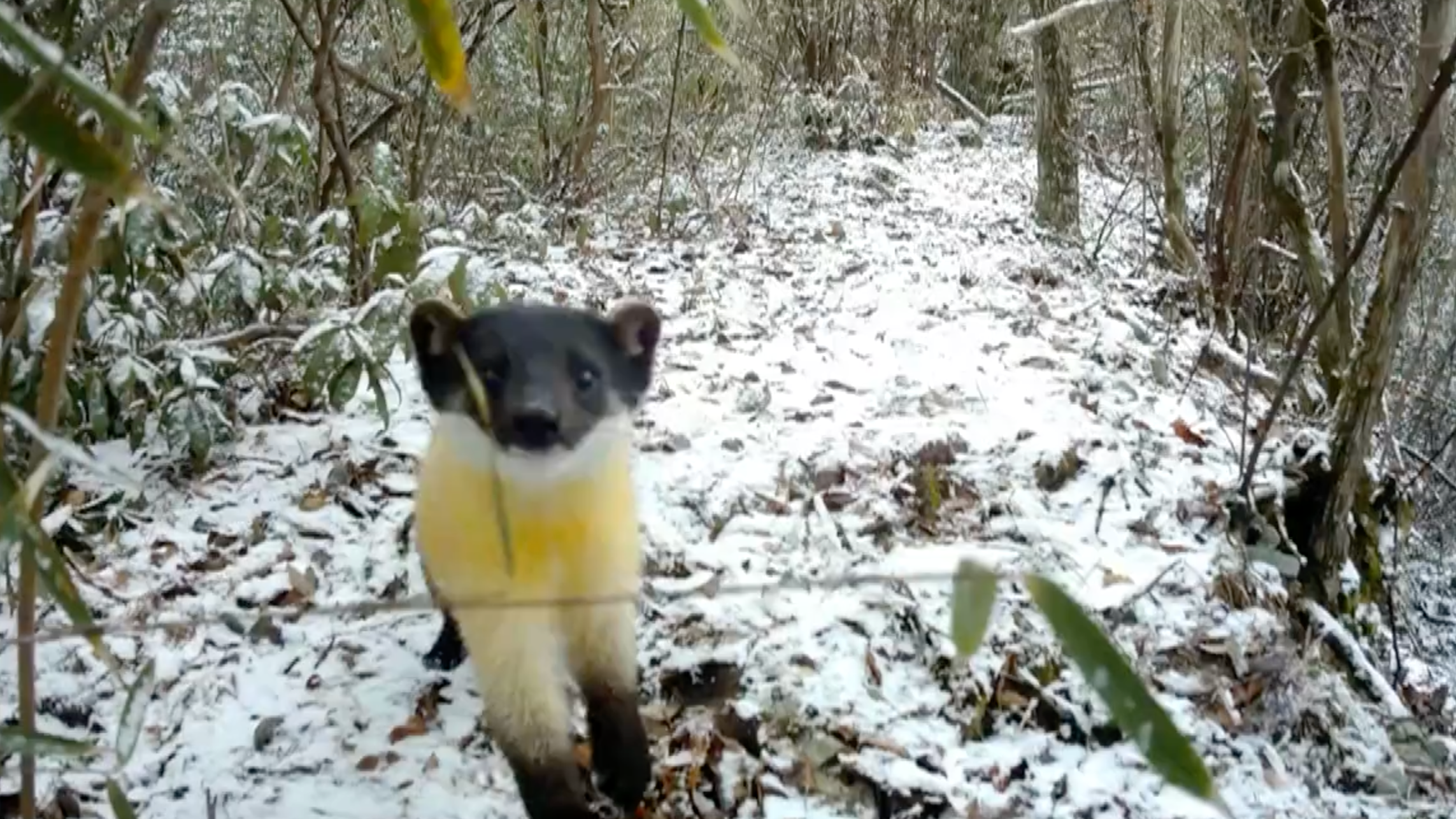 A curious yellow-throated marten was filmed taking an interest in an infrared camera installed at the Dabashan National Nature Reserve in southwest China's Chongqing Municipality. It observed the camera for at least 10 minutes before leaving.