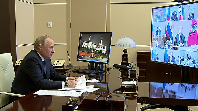 Russian President Vladimir Putin speaks during a meeting on measures of socioeconomic support of the regions via video link at the Novo-Ogaryovo residence outside Moscow, Russia, March 16, 2022. /CFP