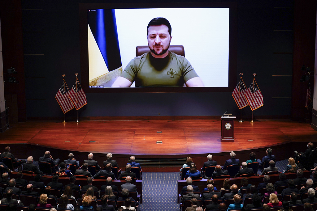 Ukrainian President Volodymyr Zelenskyy calls for a humanitarian no-fly zone over Ukraine when addressing the U.S. Congress, March 16, 2022. /CFP
